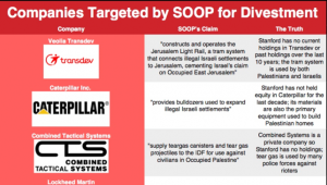 An analysis of the Stanford endowment’s quarterly SEC filings from the past decade shows no evidence that Stanford’s endowment is currently invested in any of the companies cited in the divestment materials. The filings also show no evidence that Stanford has been invested in any of these companies over the last ten years, with the exception of Raytheon for just one filing period. Moreover, in light of the significant proof that SOOP associates with the radical Boycott, Divestment, Sanctions (BDS) movement and disseminates materials calling Israel a “Jewish supremacist state”, it is clear SOOP is using this empty divestment proposal to delegitimize Israel and to implement BDS on campus.