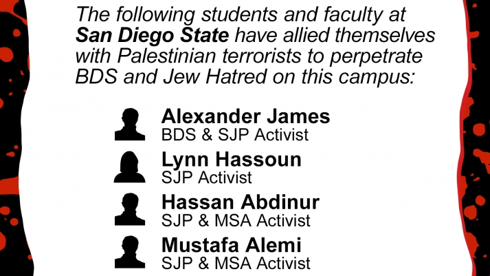 A series of posters created and disseminated by the David Horowitz Freedom Center in April identified by name a number of prominent student and faculty Boycott, Divestment and Sanctions (BDS) activists on the San Diego State University campus. DHFC, which says it “combats the efforts of the radical left and its Islamist allies to destroy American values and disarm this country as it attempts to defend itself in a time of terror,” described its targeted individuals as having “allied themselves with Palestinian terrorists to perpetrate BDS and Jew Hatred on this campus.”