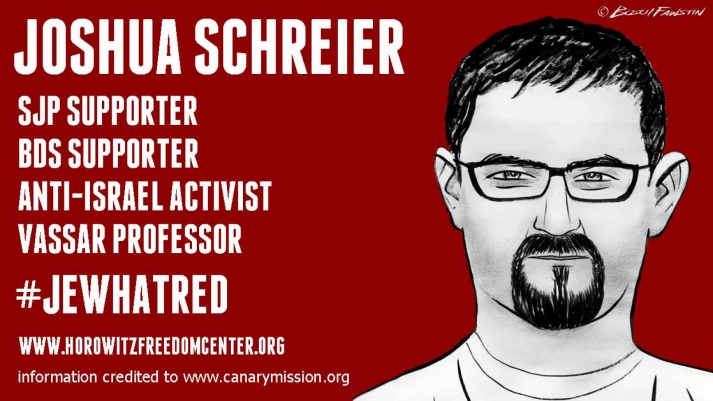 Fall 2008: Joshua Schreier, an Associate Professor of History and Director of Jewish Studies at Vassar, released his course description for a class he teaches on “The Roots of the Palestine-Israel Conflict.” Schreier is a supporter of the genocidal BDS movement against Israel. Schreier warns students that the class makes no pretense at objectivity: “Students should keep in mind that this course is NOT designed to present ‘an objective’ account of a ‘two-sided’ conflict.”