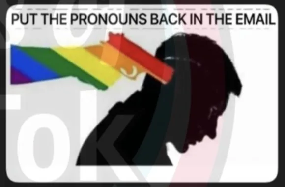 The image contained a rainbow-hued hand holding a gun pointed directly at the back of a man’s head with the caption, “Put the pronouns back in the email.” The meme is an unambiguous threat of assassination towards anyone who refuses to endorse trans ideology. Posted just weeks after the assassination of Charlie Kirk by a man who sought to defend his trans “furry” lover, the threat of violence hit particularly hard.